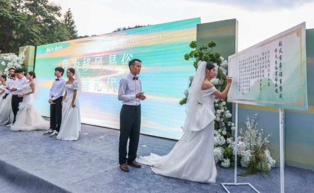 2025年8月20日,正在浙江省诸暨市东白湖镇斯宅村举行的集体婚礼上,新人正在移风易俗上签名。记者 徐昱 摄。