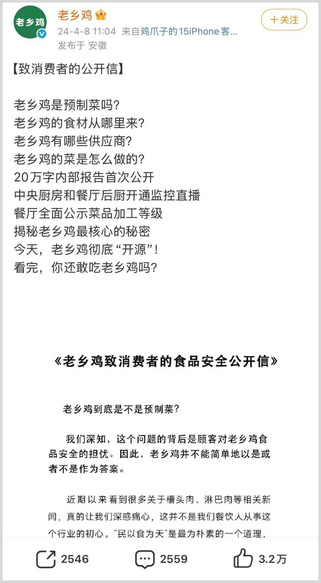 正在今天,不懂得善用社交,不会正在社交说合适的话,就等于正在和中“裸奔”。一场失败的应对,更是品牌经年累月堆集的信赖资产。从罗永浩吐槽西贝事务,到蔡国强烟花秀,再到爱康体检事务……这些企业陷入危机的缘由各不不异,但正在危机处置时犯的是不异的错误。当亿万用户已正在社交构成围不雅,企业的每一句回应都正在接管最严苛的审视。企业若不克不及将这些平台视为现实、修复信赖的桥梁,反而将其做为的舞台,正在今天的贸易中,社交的价值不只表现正在危机时辰的口碑,更是企业取用户共建信赖、展示价值的舞台。那些可以或许深刻理解社交逻辑、热诚沟通准绳的企业,正将这片特殊场域改变为巩固品牌护城河的“机缘膏壤”。老乡鸡正在预制菜风浪中的表示,取西贝构成明显对比。就正在起头质疑餐饮行业遍及利用预制菜时,网友发觉老乡鸡早已向消费者公开预制菜环境,并正在微博账号置顶预制菜清单。