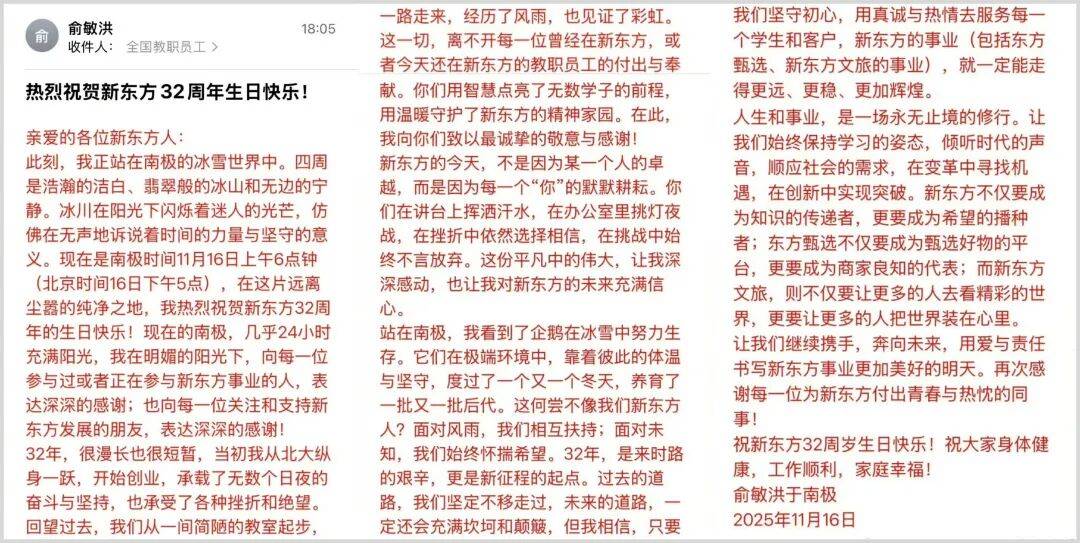 俞敏概没想到,正在教育行业弥漫几十年的本人,被狠狠教育了。网友大要也没想到,这一次,被群嘲的老俞竟然口碑反转了。11月16日是新东方32周韶华诞,此日晚上,正在一线“搬砖”的新东方员工收到了老板的周年贺信。除了对员工及支撑者暗示感激外,信中还用富丽的言语描述着南极的纯洁取诱人。